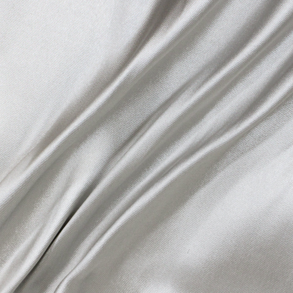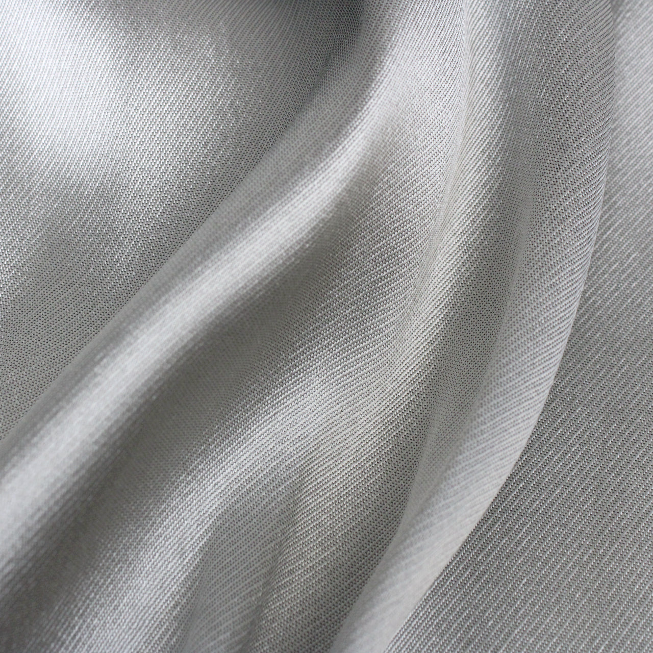 Silver colored serge fabric. Burn tested silk content. Measures 59" wide and available for order as a 1.5 yard piece.
