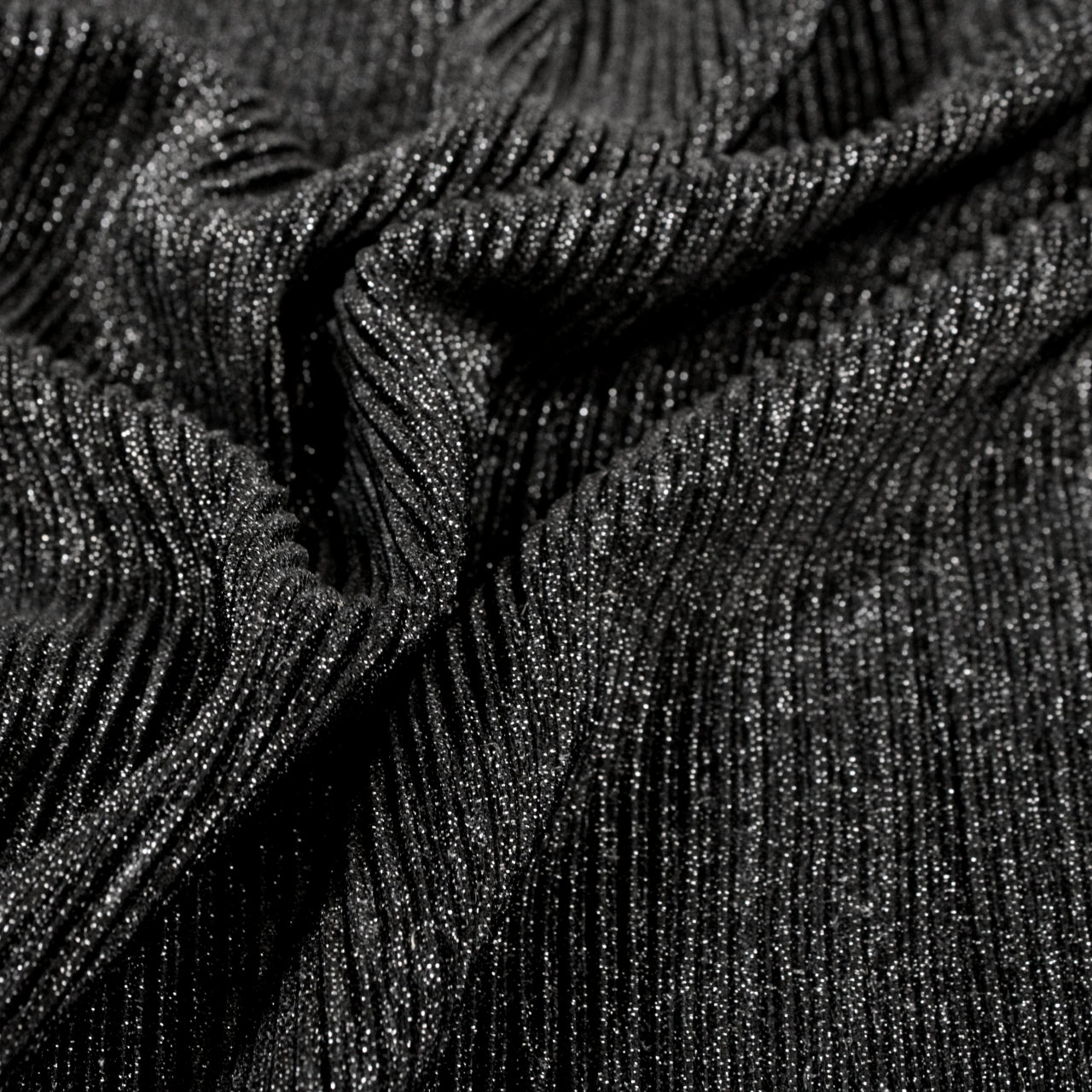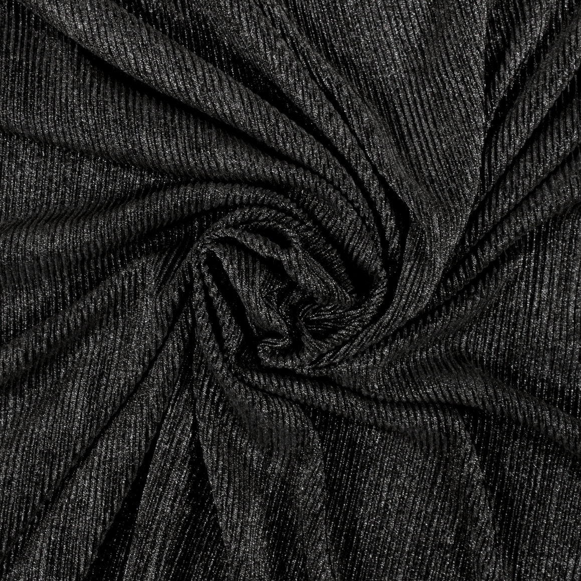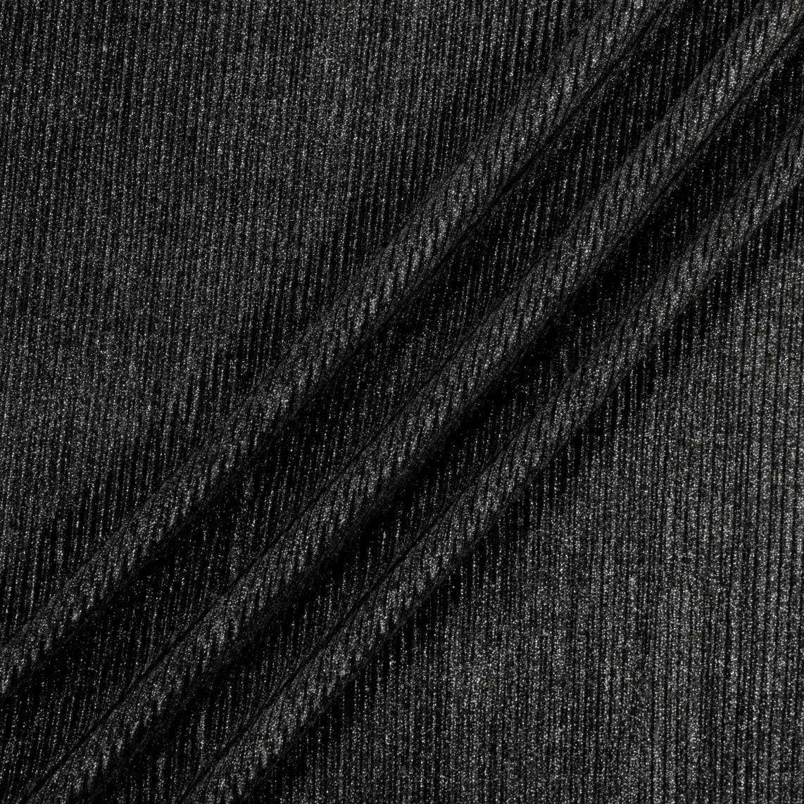 Lightweight black stretch knit fabric with rib-crinkle texture and sparkly lurex threads knit in. Burn tested synthetic content. Measures 58" in useable width and available for order by the yard.