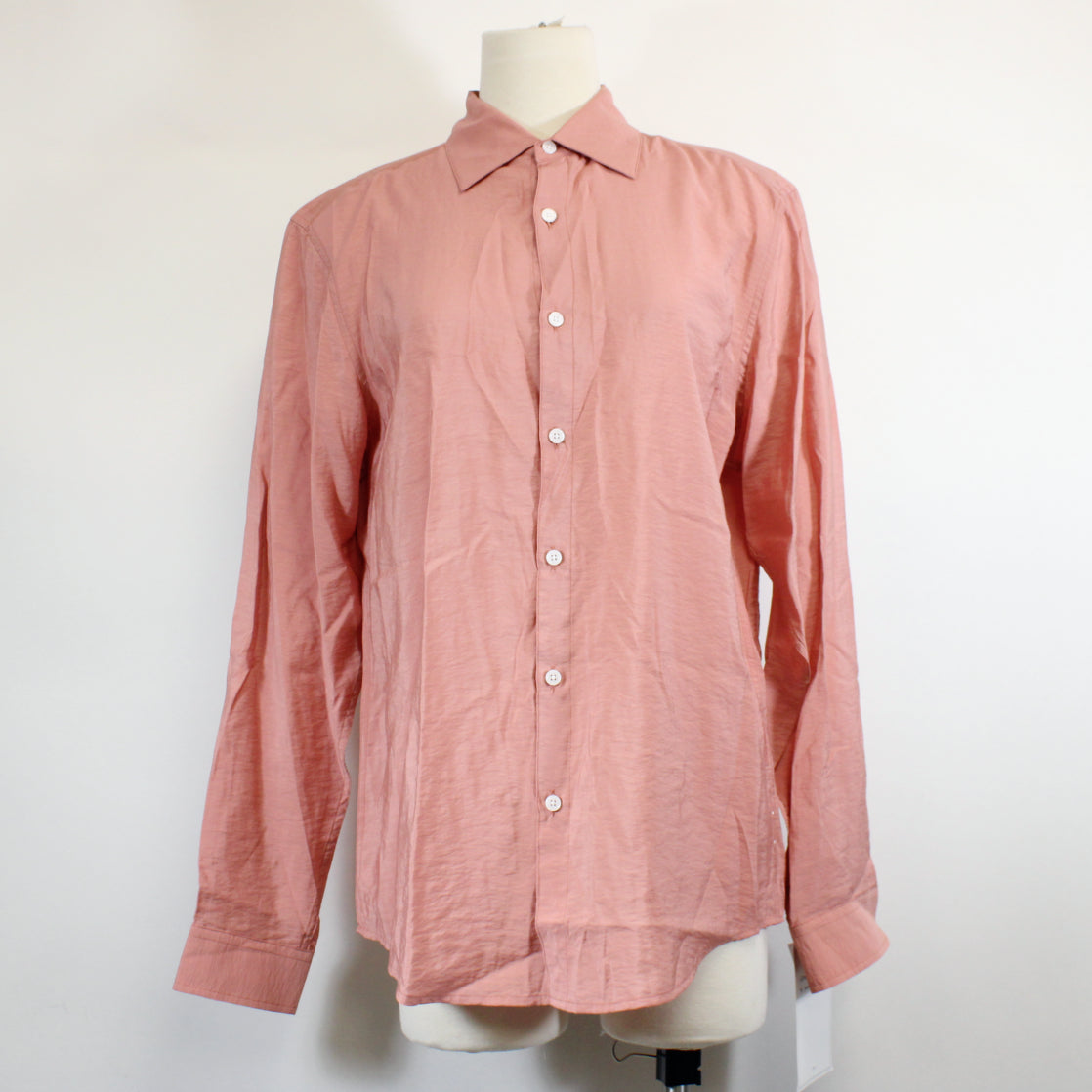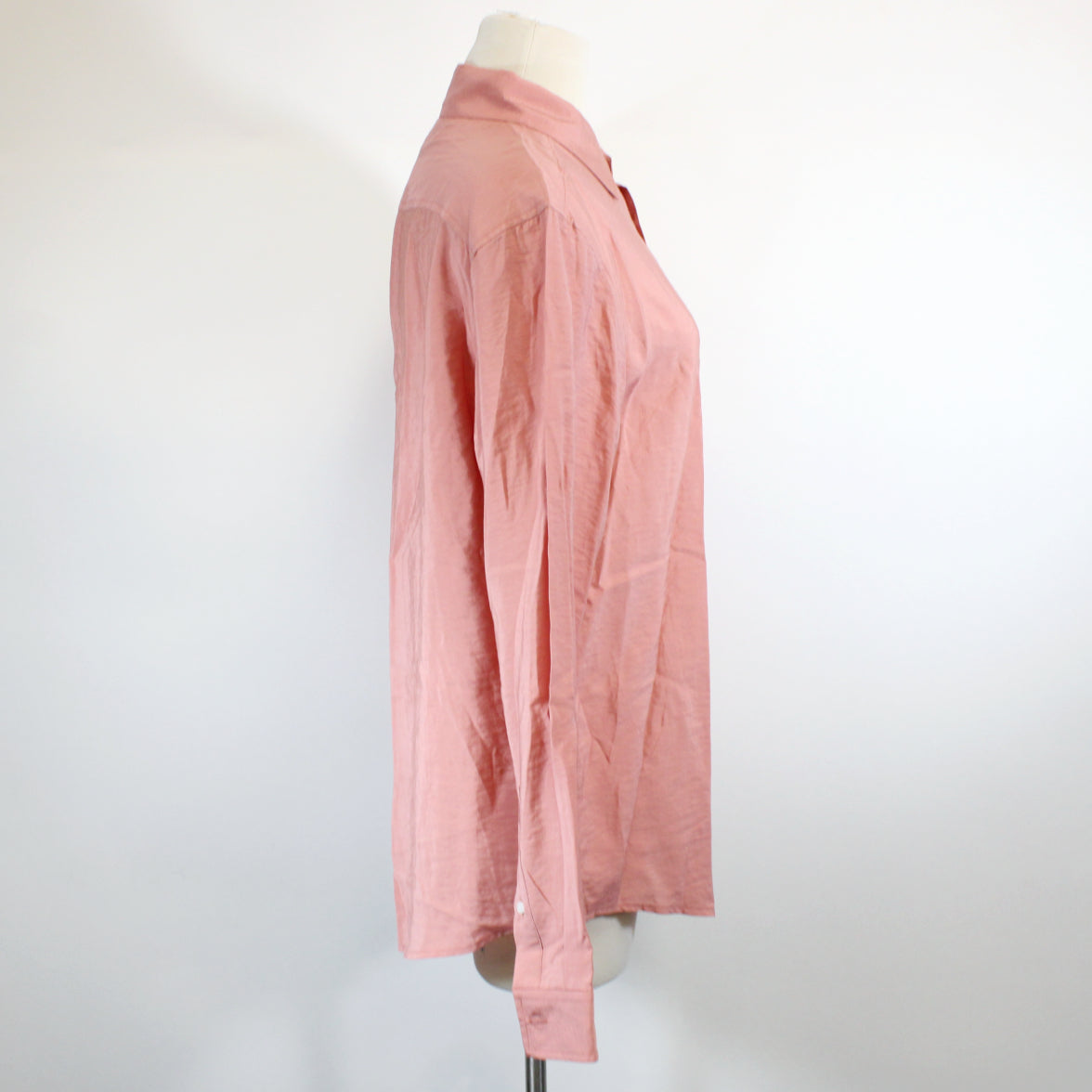 Salmon button-up shirt in a lightweight, silky fabric with a subtle shine. Fiber content is labeled as 85% rayon 15% nylon.