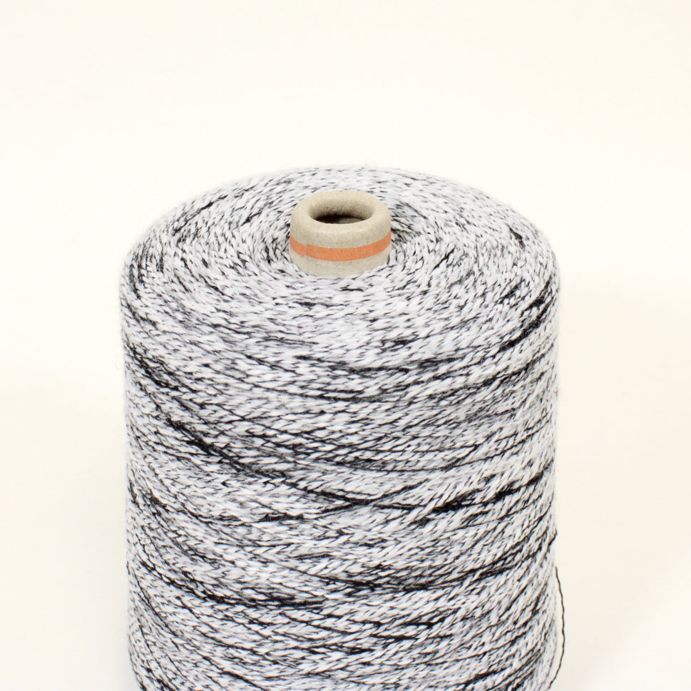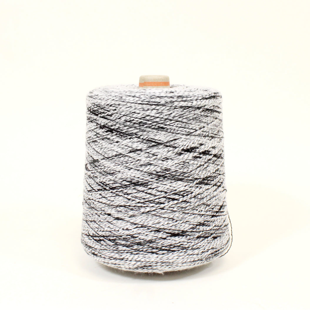 Black and white curly slub yarn. Labeled as 53% polyester 47% acrylic content. Available for purchase as a 2.2lb cone.